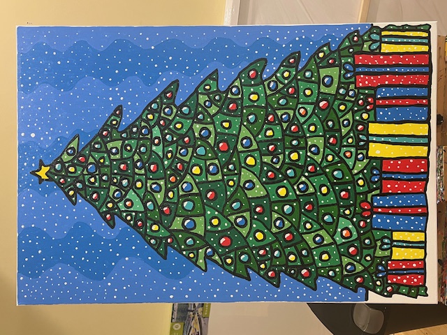 - Blue, Christmas, Christmas Tree, Festive, Green, Orange, Ornaments, Presents, Red, Winter Landscape, Yellow